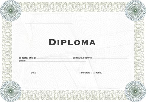 | Diploma clasica, se preteaza la orice fel de competitie sau ca si recunoasterea faptului ca a terminat un curs. Are diverse elemente de siguranta, care o fac greu de copiat sau imitat. Diploma este disponibila in diferite culori, la cerere. |