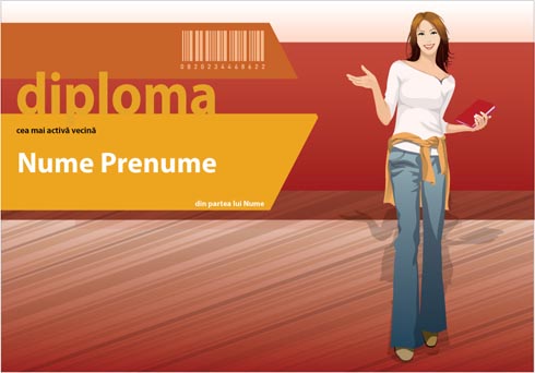 | Diploma pentru cea mai activa vecina este pentru ea, cea care ii ajuta pe cei in nevoie, care spune o vorba buna atunci cand vede pe cineva suferind, care fuge pana la alimentara, pana la piata sa ia o paine, o varza, ... daca vre-un vecin nu se descurca cu cumparaturile. |