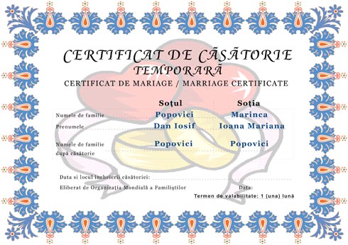 | Certificatul de casatorie temporara poate fi folosit de catre perechile indragostite care inca nu vor in mod neaparat sa-si oficializeze relatia si in fata statului roman. Poate fi considerata o joaca a adultilor. |