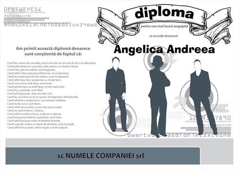 | Consideri ca intr-adevar, ea este cea mai bun angajata a ta? Fa-i o surpriza! Sau poate ai o colega care se considera un angajat model. Cu siguranta va fi incantata de un asemenea cadou. Diploma pentru cea mai buna angajata te asteapta. Gaseste cui i s-ar potrivi?